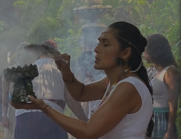 Su camino incluye años de formación con guardianes de distintas comunidades, práctica constante con los elementos y servicio en ceremonias colectivas e individuales.